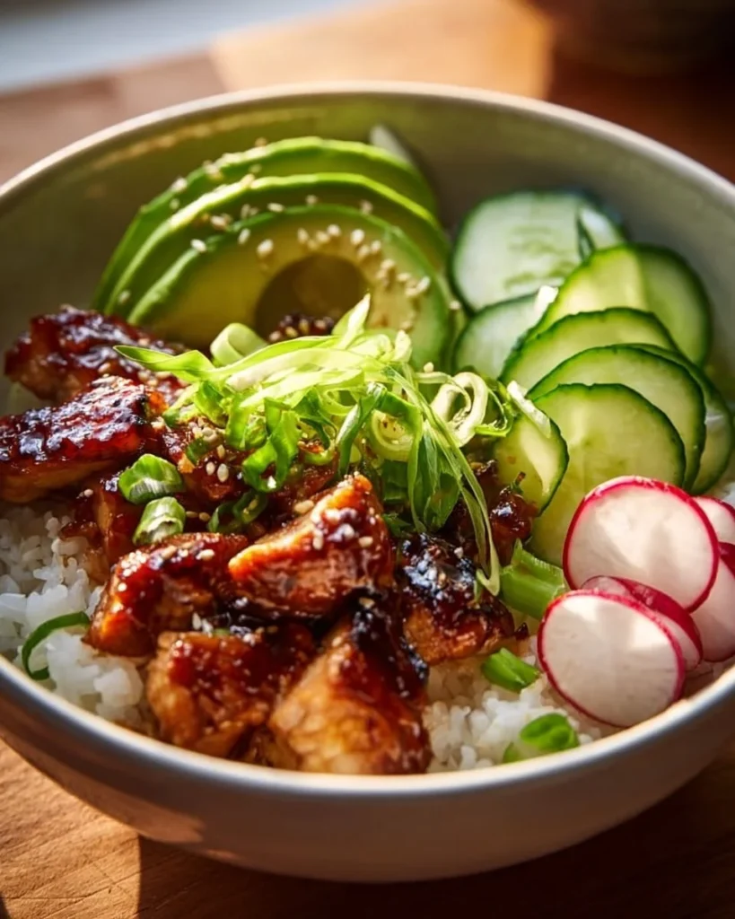 For the best presentation, place a scoop of rice on each plate. Arrange the sliced chicken on top, and then add the avocado slices and fresh vegetables. You can add extra lime juice or soy sauce for more flavor. This dish is great served warm but can also be enjoyed cold.