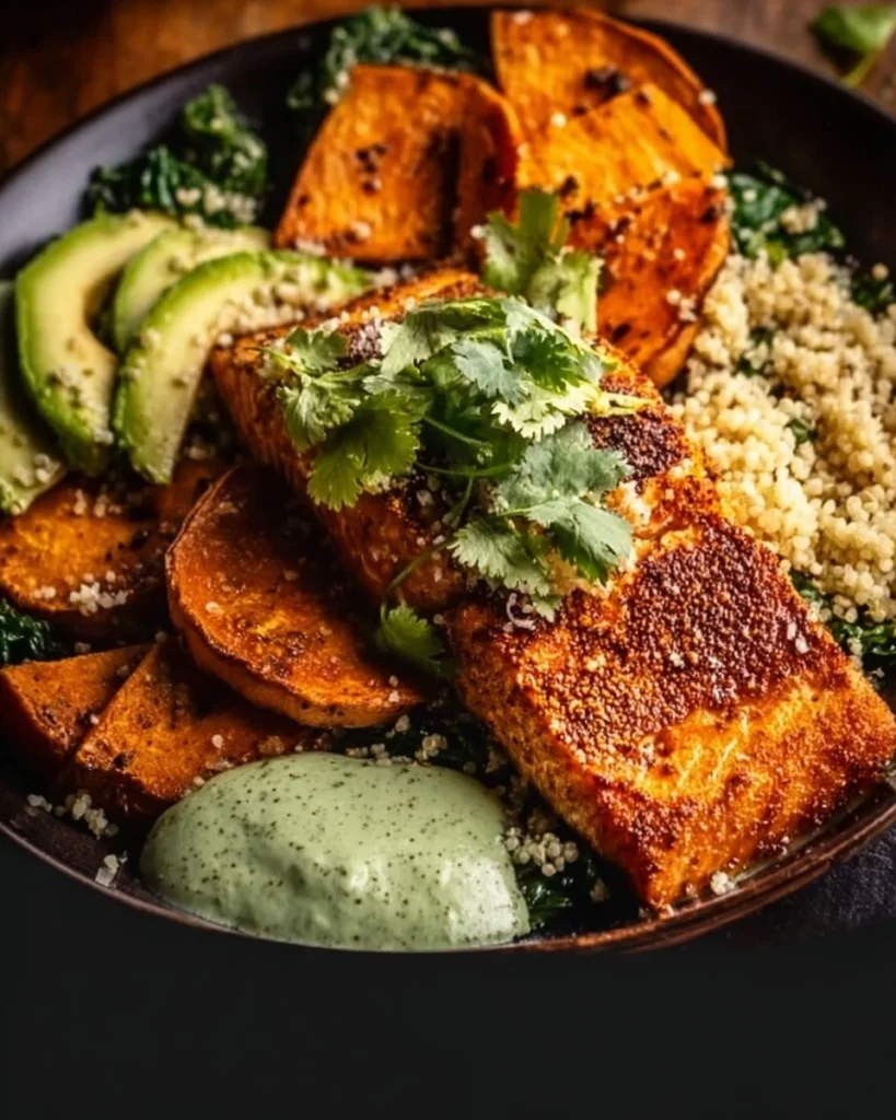 - Divide the quinoa or brown rice between bowls. Top with salmon, potatoes, onions, peppers, kale, and avocado.