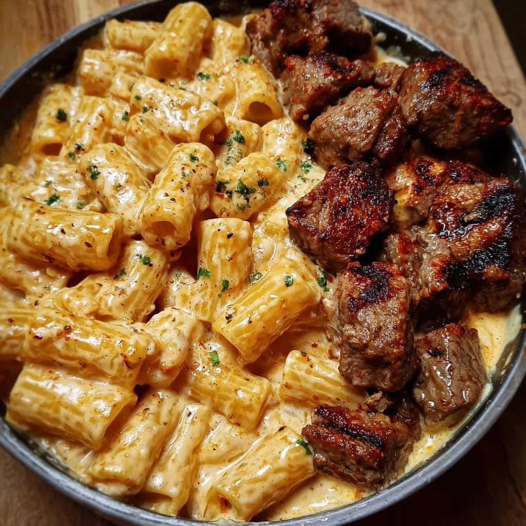 Cajun Steak Tips in Cheesy Rigatoni Parmesan Sauce